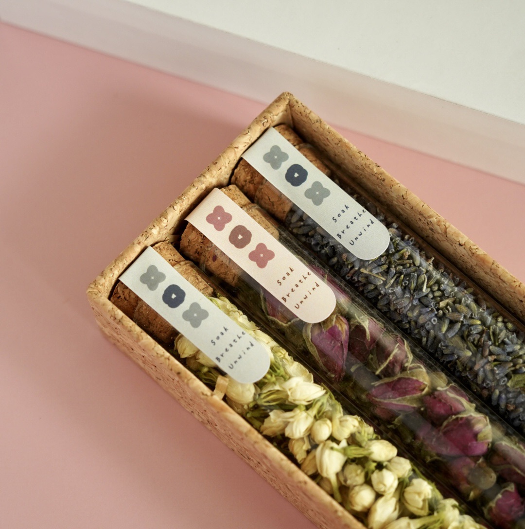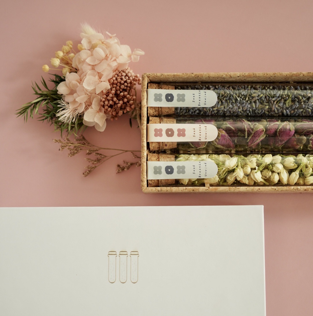 這款「循光環盒」,不僅盛裝了三支試管花茶與茶包袋,