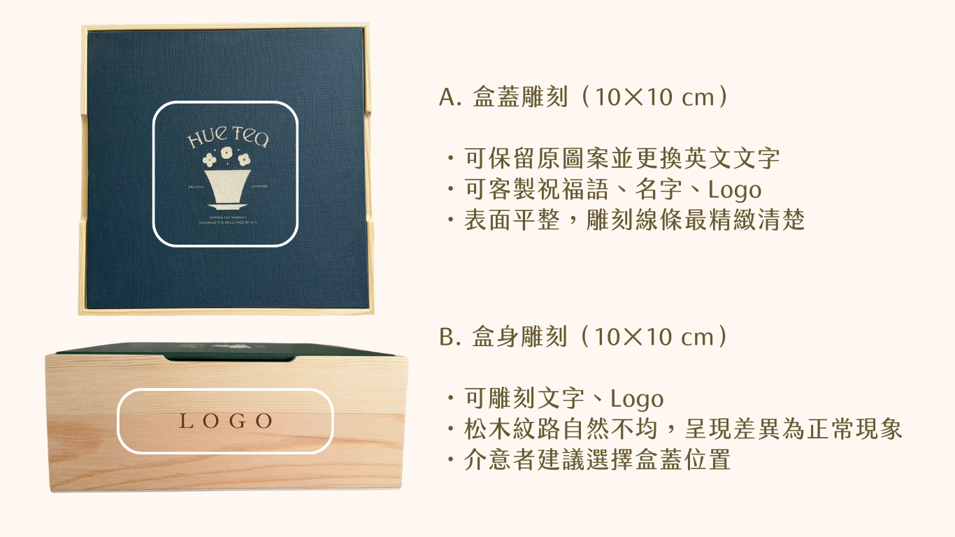 ・刻字位置將依禮盒設計與字數做最佳排版,出稿前可提供預覽確認。